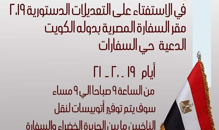 بدات القنصليات المصرية بالخارج اليوم عملية التصويت على تعديل الدستور ، والتى ستستمر لمدة ثلاثة ايام حتى يوم الاحد الموافق 21 ابريل 2019 .