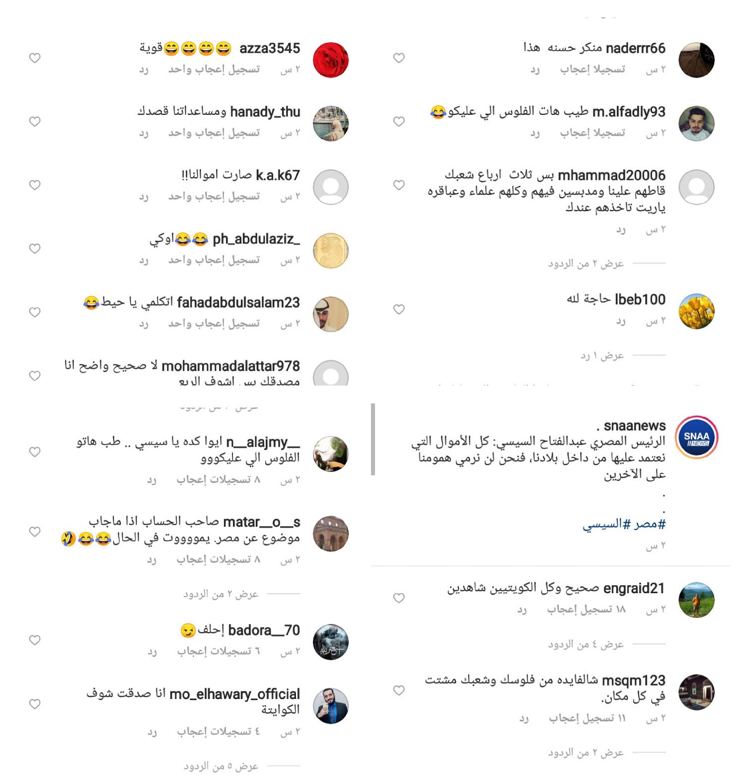 وفى نفس الوقت تظهر الردود المسيئة لمصر ورئيسها وشعبها على الاخبار ،  والتى تبين مدى حقد وكره قلة من الكويتين على مصر والمصريين .