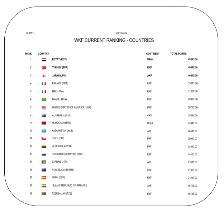 ثانيا : انجازات الاتحاد على مستوى التصنيف العالمى للدول فى الكاراتيه .