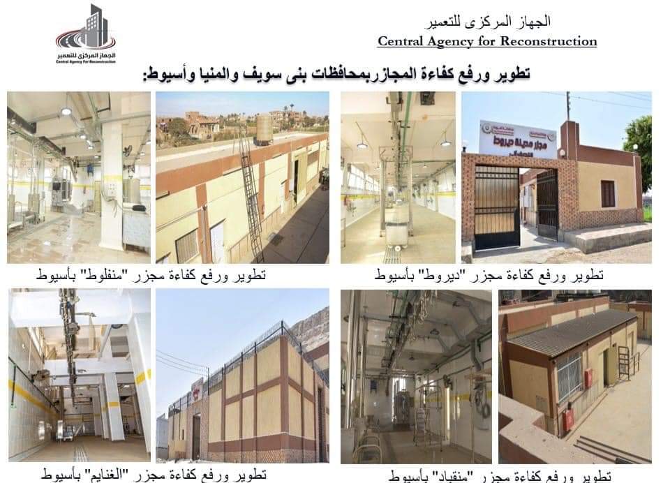 وذكر اللواء عمرو رشدي، رئيس جهاز تعمير وسط وشمال الصعيد، أن الجهاز انتهى من تنفيذ وتسليم 4 مجازر بمراكز (ديروط – منفلوط – الغنايم – منقباد) بمحافظة أسيوط، كما يجرى الانتهاء من مجزر بني أحمد بمحافظة المنيا، ومجزر سمسطا بمحافظة بنى سويف، ضمن مشروع تطوير ورفع كفاءة المجازر، بتمويل من وزارة التنمية المحلية.