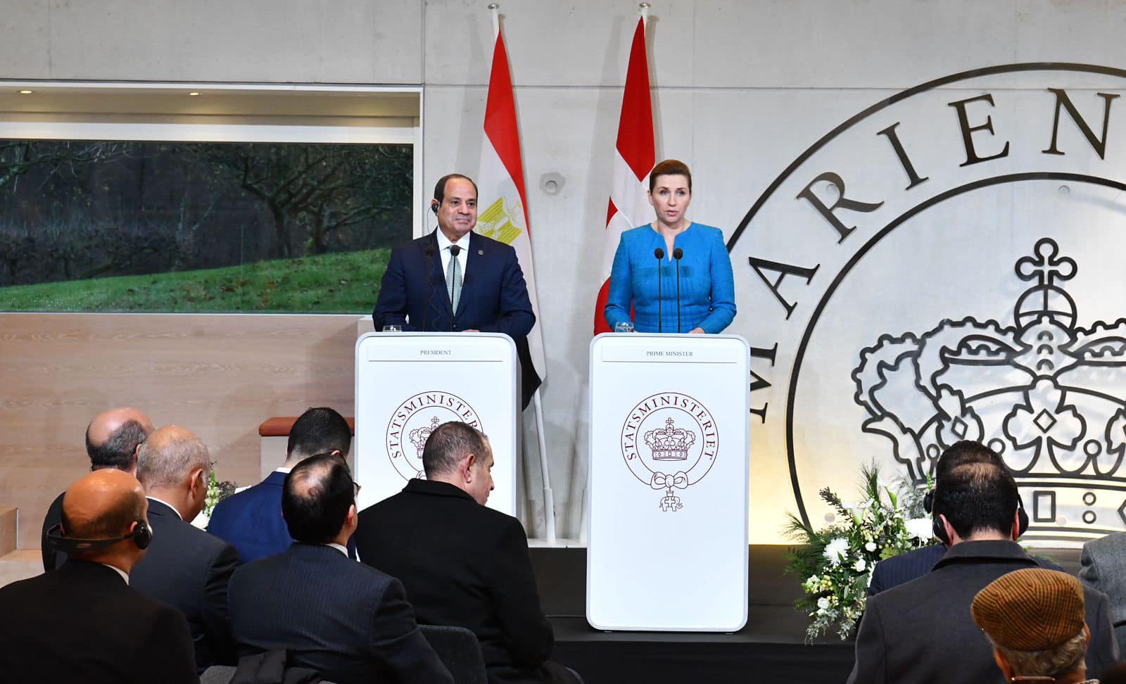 وقد عقد الجانبان مؤتمراً صحفياً تناول نتائج المباحثات بين الرئيس ورئيسة وزراء الدنمارك، وفيما يلي نص كلمة الرئيس خلال المؤتمر الصحفي: