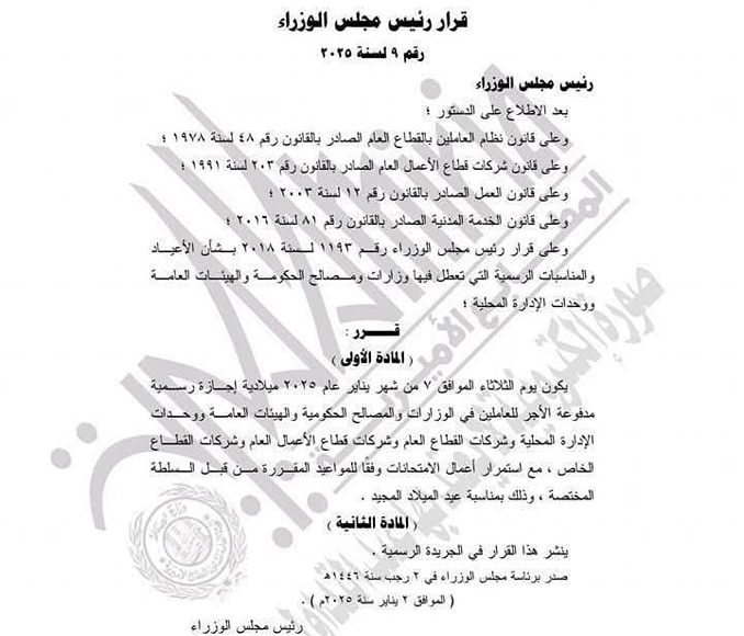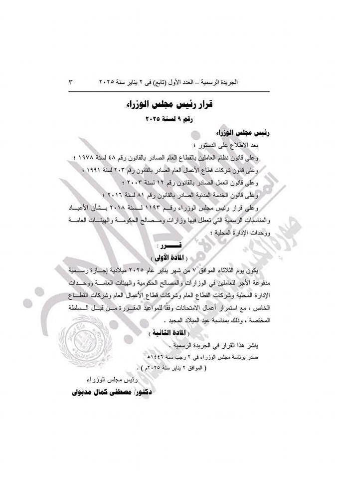 ️قرار رئيس مجلس الوزراء رقم [٩] لسنة ٢٠٢٥م يكون يوم الثلاثاء الموافق ٧ من شهر يناير عام ٢٠٢٥ ميلادية إجازة رسمية مدفوعة الأجر للعاملين في الوزارات والمصالح الحكومية والهيئات العامة ووحدات الإدارة المحلية وشركات القطاع العام وشركات قطاع الأعمال العام وشركات القطاع الخاص ، مع استمرار أعمال الامتحانات وفقًا للمواعيد المقررة من قبل السلطة المختصة ، وذلك بمناسبة عيد الميلاد المجيد .