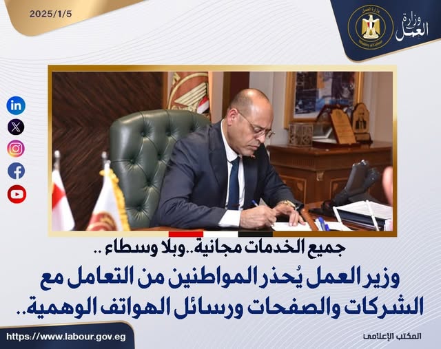 وحذر المواطنين، من الإدلاء ببياناتهم الشخصية لأي شخص يدعي انتسابه للوزارة…وأكد على أن كافة الخدمات التي تُقدمها وزارة العمل، يتم الإعلان عنها بشكل رسمي عبر قنوات الاتصال الرسمية، سواء على الموقع الإلكتروني عبر الرابط التالي: www.labour.gov.eg ..أو صفحة الوزارة على موقع «فيس بوك»: https://www.facebook.com/profile.php?id=100064535599158 ، وليس من خلال التواصل مع المواطنين هاتفياً، أو عبر الرسائل النصية…