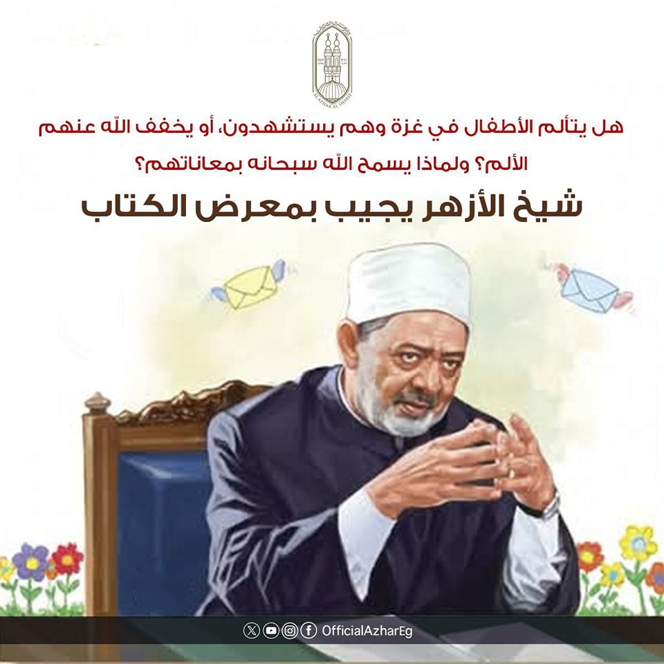 الازهر الشريف : شيخ الأزهر يجيب بمعرض الكتاب هل يتألم أطفال غزة وهم يستشهدون؟ ولماذا يسمح الله بمعاناتهم؟