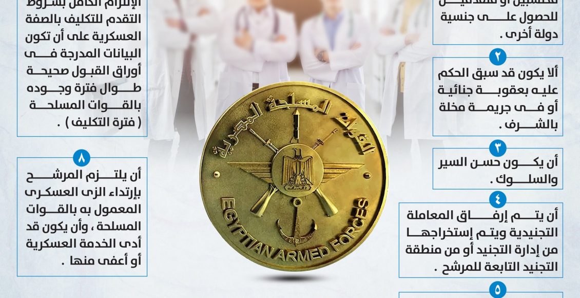 القوات المسلحة : قبول دفعة جديدة من الأطباء البشريين الحاصلين على درجة الماجستير والدكتوراه للعمل كضباط مكلفين بالقوات المسلحة بالصفة العسكرية دفعة يوليو 2025