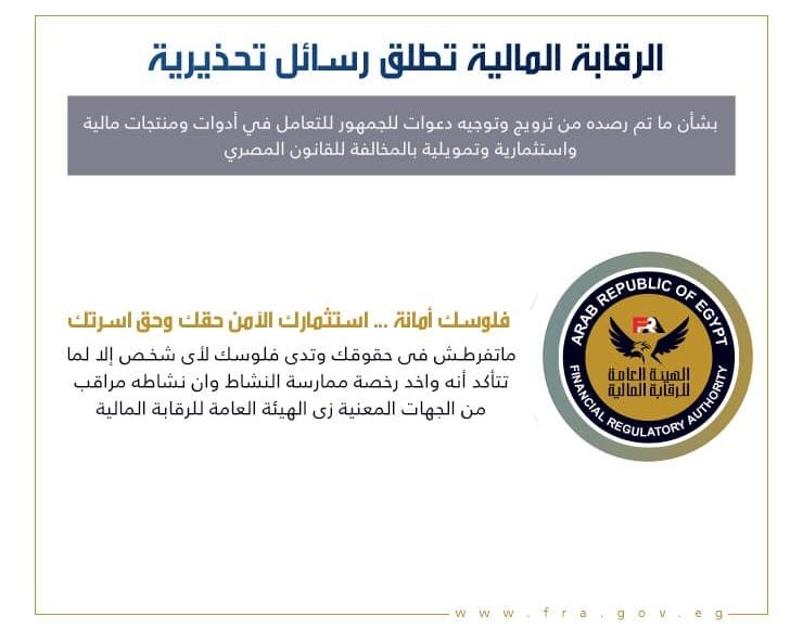 الهيئة العامة للرقابة المالية: تطلق تحذير بشأن ما تم رصده من ترويج وتوجيه دعوات للجمهور للتعامل في أدوات ومنتجات مالية واستثمارية وتمويلية بالمخالفة للقانون المصري