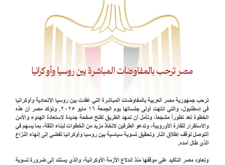 ترحب جمهورية مصر العربية بالمفاوضات المباشرة التي عُقدت بين روسيا الإتحادية وأوكرانيا في إسطنبول، والتي انتهت أولى جلساتها يوم الجمعة ١٦ مايو ٢٠٢٥. وتؤكد مصر أن هذه الخطوة تعد تطوراً مشجعاً، وتأمل أن تمهد الطريق لفتح صفحة جديدة لاستعادة الهدوء والأمن والاستقرار للقارة الأوروبية، وتدعو الطرفين لاتخاذ مزيد من الخطوات لبناء الثقة، بما يسهم في التوصل لوقف إطلاق النار وتحقيق تسوية سياسية بين روسيا وأوكرانيا تفضي إلى إنهاء النزاع الذي طال أمده.