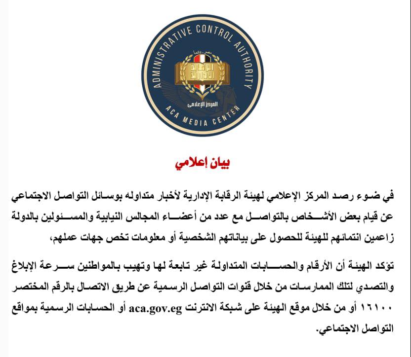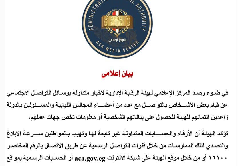 فى ضوء رصد المركز الاعلامى لهيئة الرقابة الادارية لاخبار متداولة بوسائل التواصل الاجتماعى عن قيام بعض الاشخاص بالتواصل مع عدد من اعضاء المجالس النيابية والمسئولين بالدولة زاعمين انتمائهم للهيئة للحصول على بياناتهم الشخصية او معلومات تخص جهات عملهم .