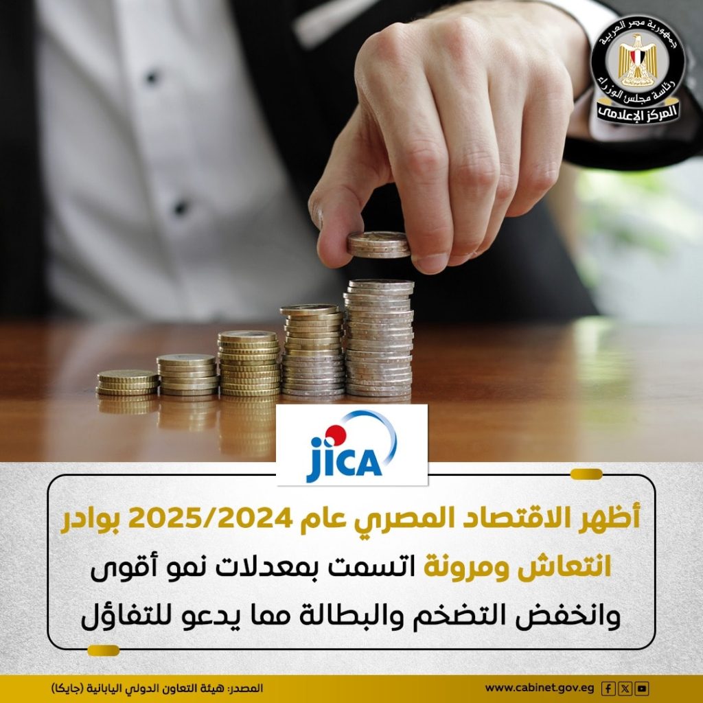 عاجل : أكدت هيئة التعاون الدولي اليابانية (جايكا) أن الاقتصاد المصري واصل تعافيه القوي، حيث سجل نموًا بلغ 4.77% في الربع الثالث من عام 2025/2024 – وهو أعلى معدل نمو ربع سنوي في ثلاث سنوات – ارتفاعًا من 2.2% في الربع ذاته من العام الماضي، وأشارت الهيئة إلى أن نمو قطاع الصناعات التحويلية ارتبط بتحسن ملحوظ في أداء الصادرات، مما عزز دور القطاع الصناعي كمحرك رئيسي للنمو.