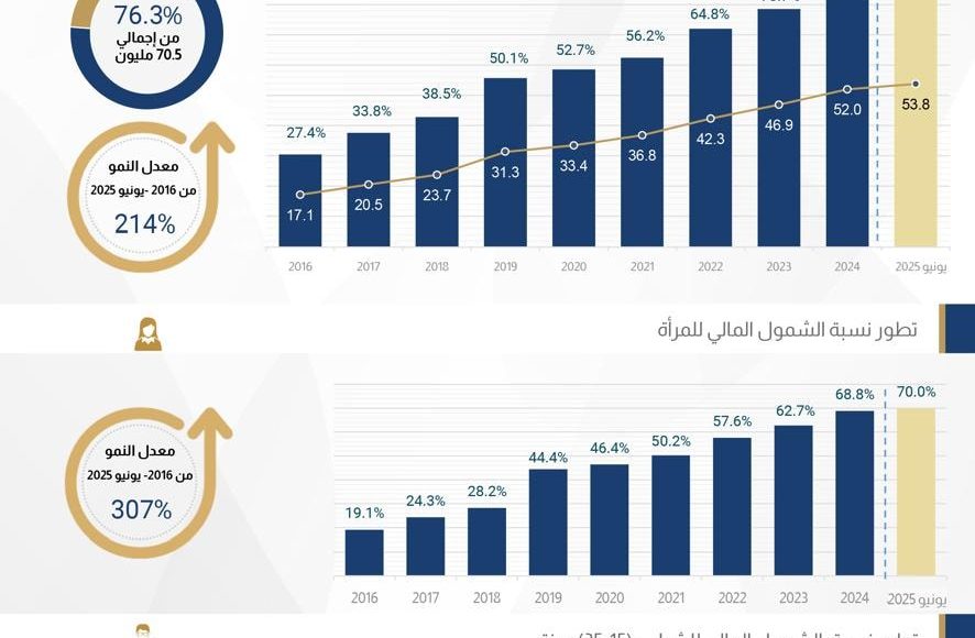 وبشكل عام، بلغ معدل نمو الشمول المالي نسبة 214% خلال الفترة من 2016 حتى يونيو 2025، مما يعكس زيادة استفادة المواطنين من الخدمات المالية.