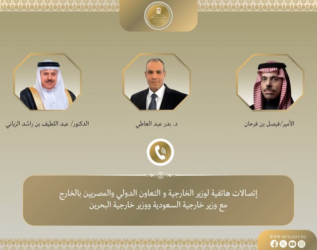 جرى اتصالان هاتفيان بين د. بدر عبد العاطي وزير الخارجية والتعاون الدولي والمصريين بالخارج، وكل من صاحب السمو الأمير فيصل بن فرحان وزير خارجية المملكة العربية السعودية الشقيقة، والدكتور عبد اللطيف بن راشد الزياني وزير خارجية مملكة البحرين الشقيقة، يوم الأربعاء ٢٥ مارس، وذلك في إطار التشاور والتنسيق المستمر إزاء التطورات الإقليمية المتسارعة.