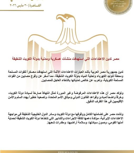 وتشدد مصر على تضامنها الكامل ووقوفها مع دولة الكويت وسائر الدول الخليجية الشقيقة في مواجهة الاعتداءات الإيرانية، مؤكدة دعمها لكافة الإجراءات والتدابير التي تتخذها دولة الكويت الشقيقة لحماية أمنها القومي، وصون سيادتها، وسلامة أراضيها، ومقدرات شعبها.